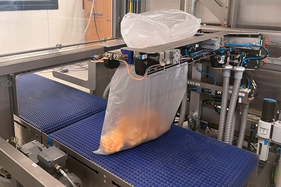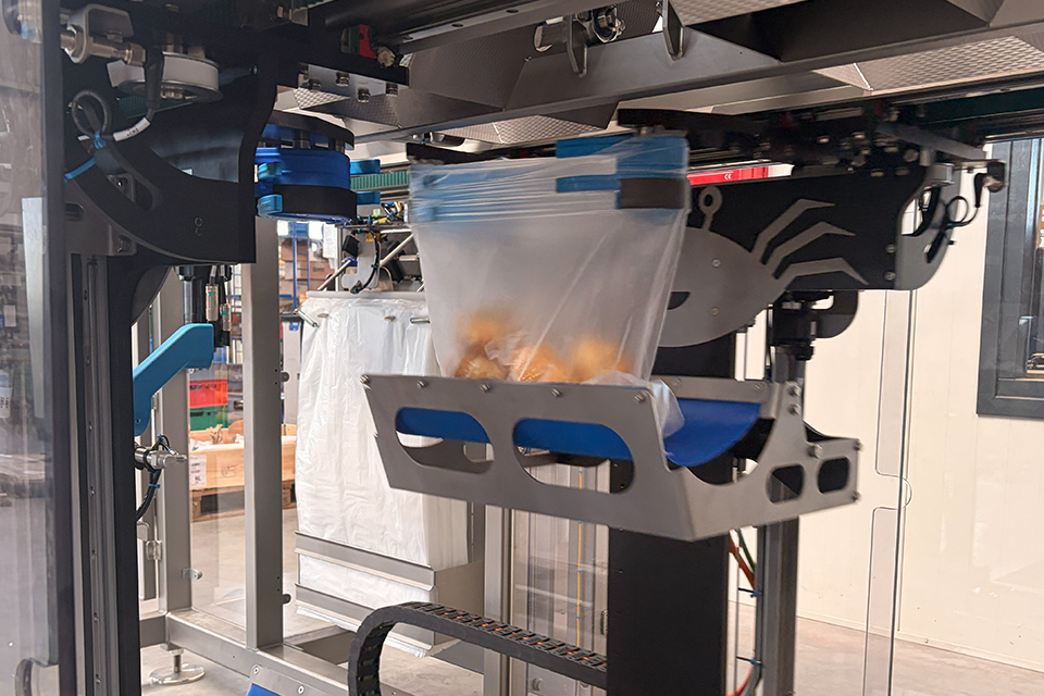 The premade EasyOpen bag is picked up by a vacuum gripper at one side.