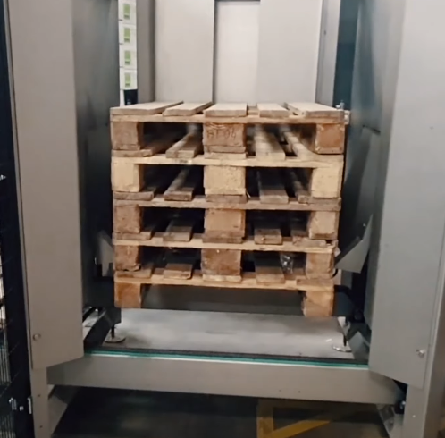 The pallet destacker will take a pallet from a stack and move it so your products can be packed