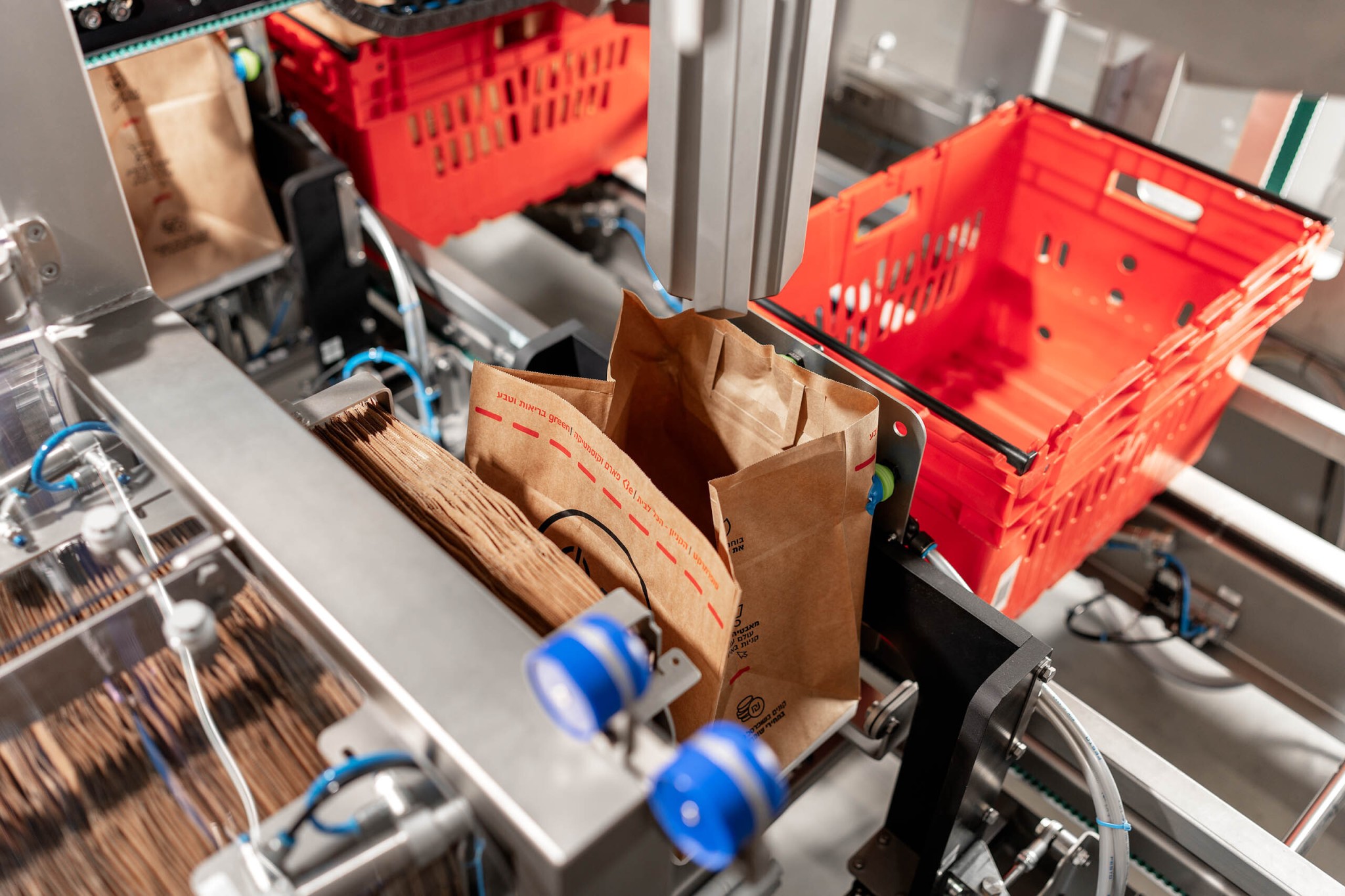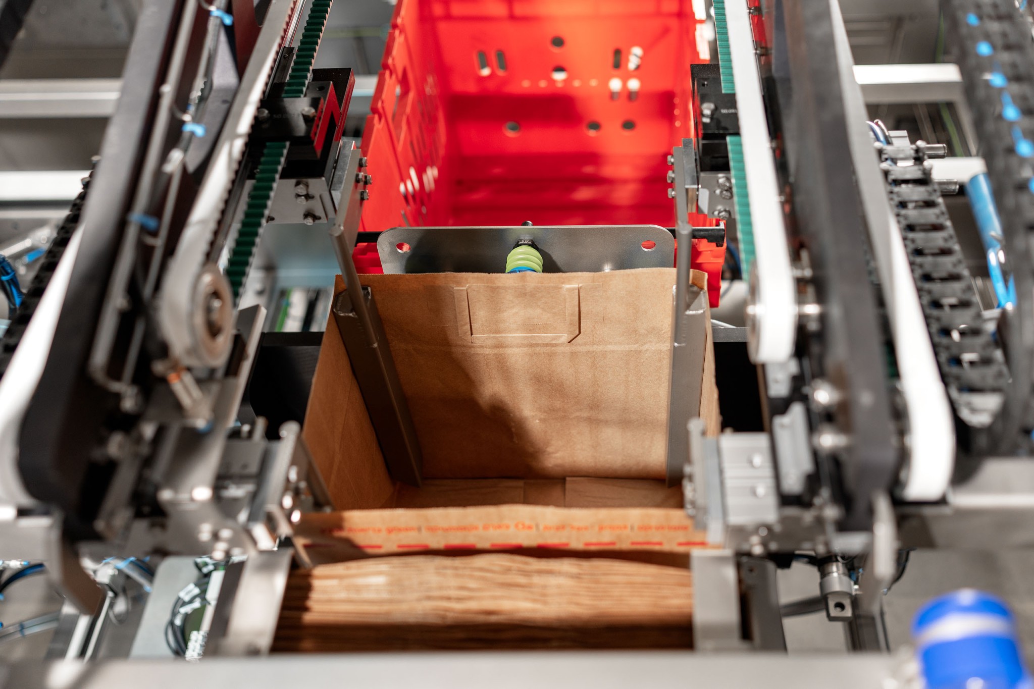 Every paper bag is taken at the bottom with suction cups out of the magazin. Another suction cup on the back of the bag is opening the paper bag