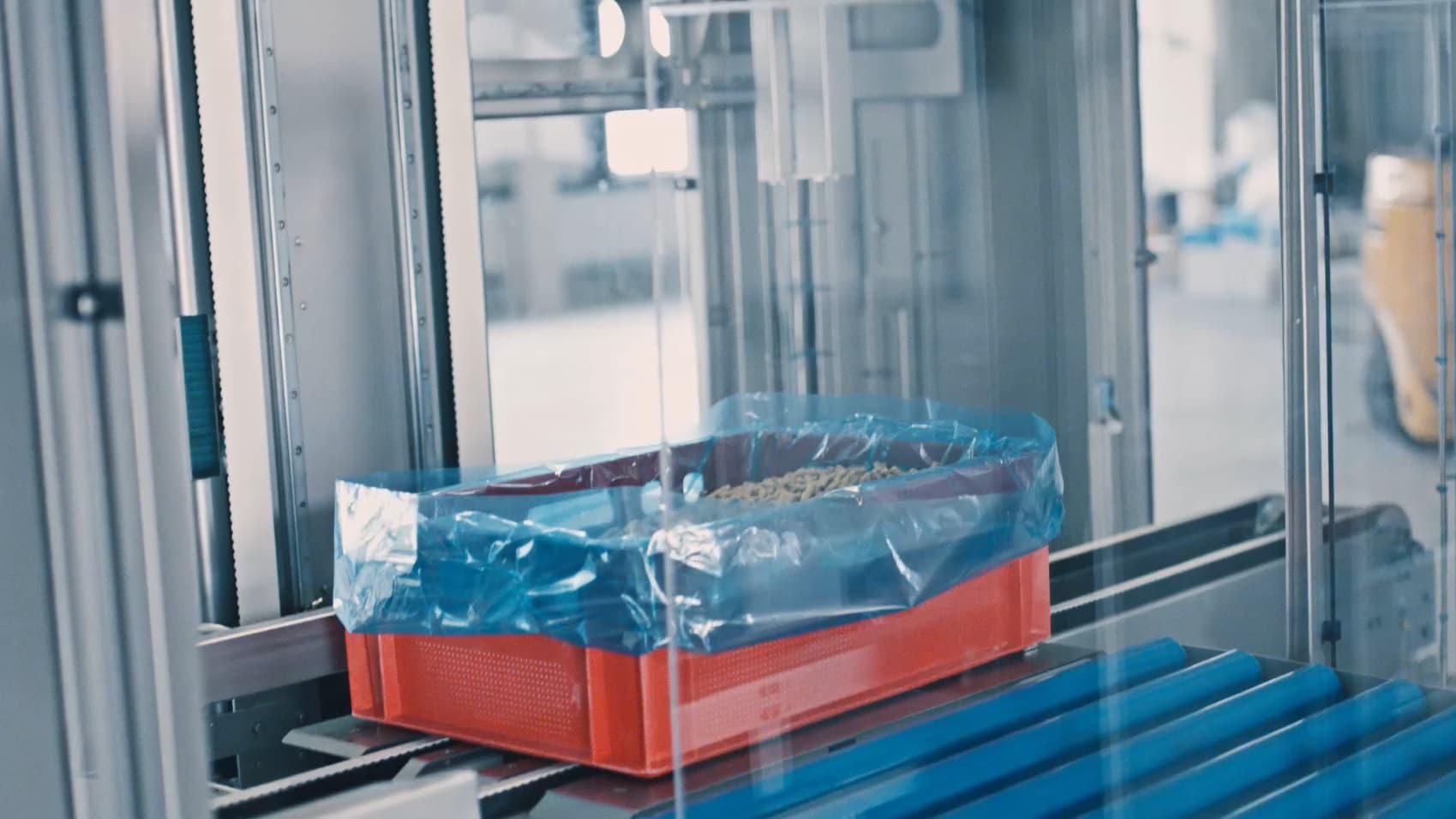 The box is lifted towards the clipping unit. Here two vacuum cups pick up the bag on the short sides of the box.
